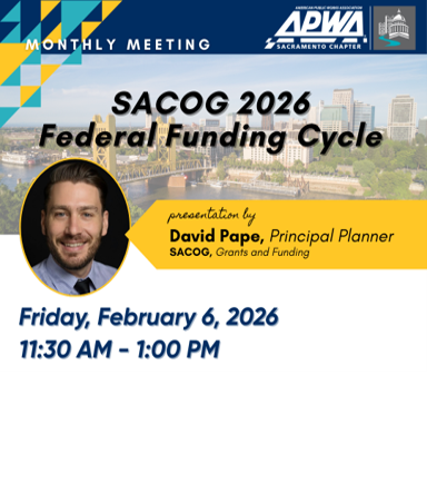 Join the APWA Sacramento Chapter for an informative presentation by Principal Planner David Pape on the upcoming 2026 SACOG Federal Funding Cycle