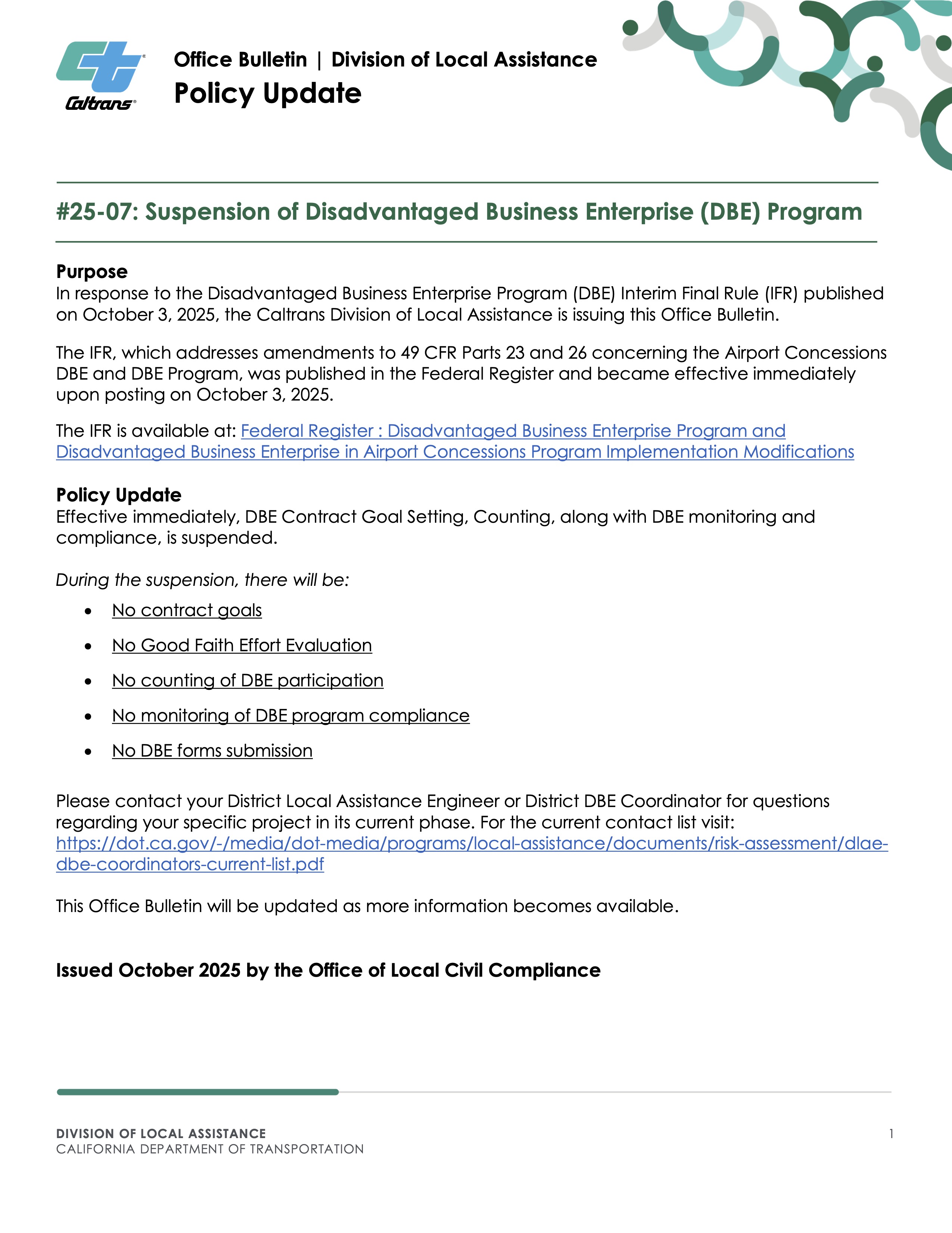 As a result of these program changes, Caltrans Division of Local Assistance issued Office Bulletin 25-07 announcing DBE Contract Goal Setting and DBE Monitoring & Compliance are suspended. The suspension excludes: