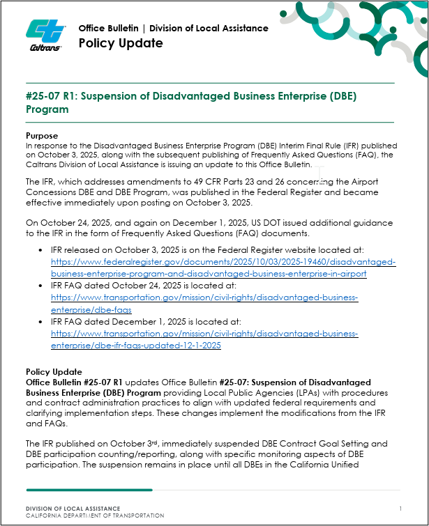 In response to these program changes, Caltrans Division of Local Assistance issued an update to this Office Bulletin, suspending components of the DBE Program in the Local Assistance Procedures Manual (LAPM).