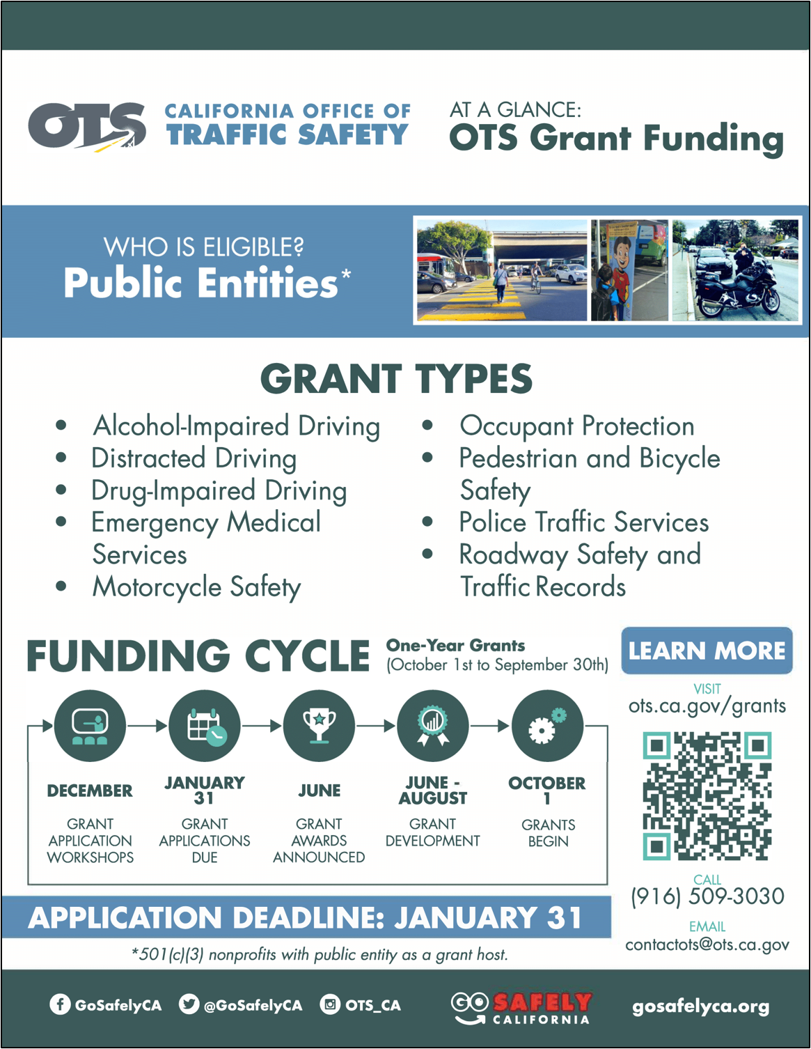 The California Office of Traffic Safety (OTS) is now accepting grant applications for Federal Fiscal Year 2027 (October 1, 2026, through September 30, 2027) for projects that seek to prevent serious injury and death resulting from motor vehicle crashes.