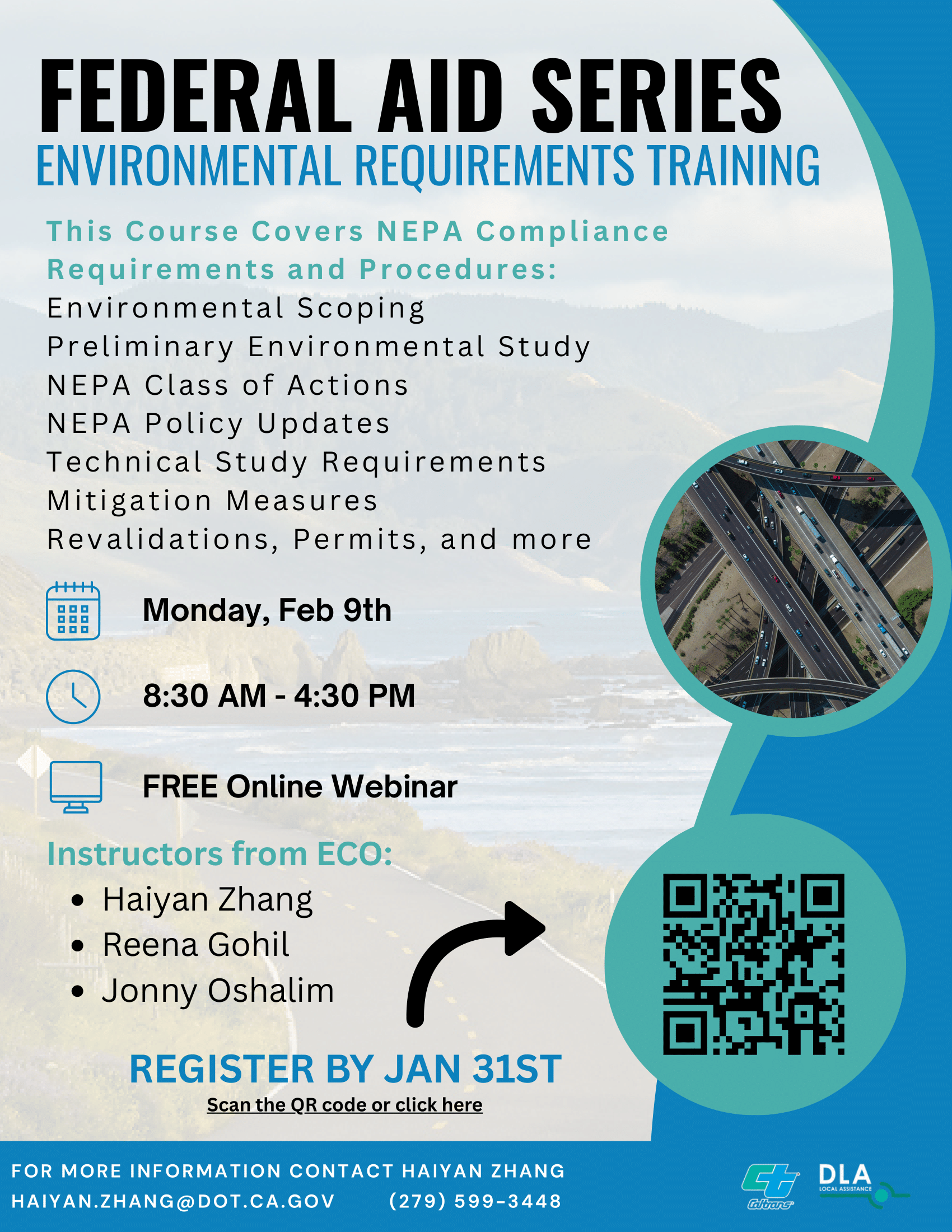 This one-day live online course, part of the Federal Aid Series of trainings, is designed to teach local public agency staff the environmental process for federal aid projects, outlining both the process and the differences in on-system and off-system projects and NEPA compliance requirements.
