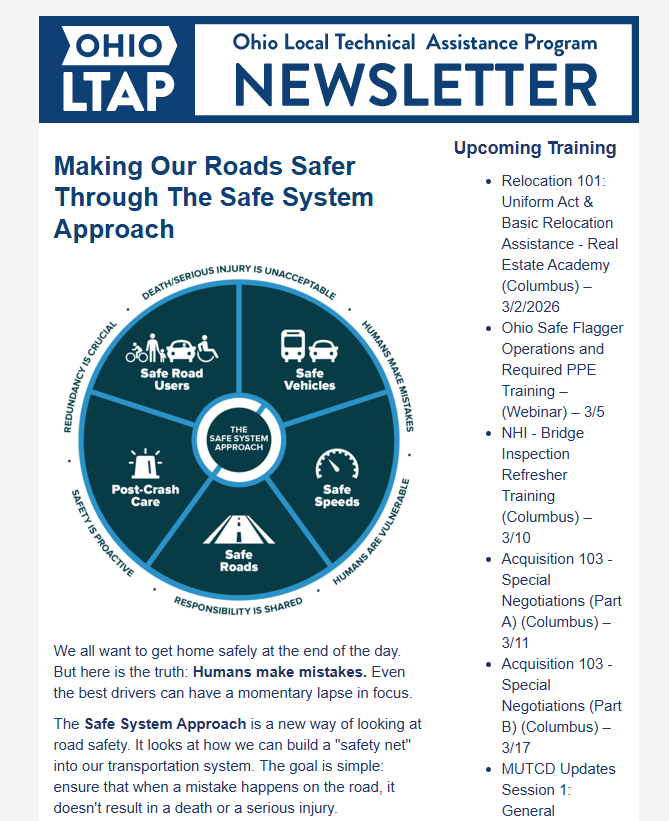 Ohio LTAP spotlights U.S. DOT's Safe System Approach (SSA) in its latest newsletter (Issue1, Volume 42).