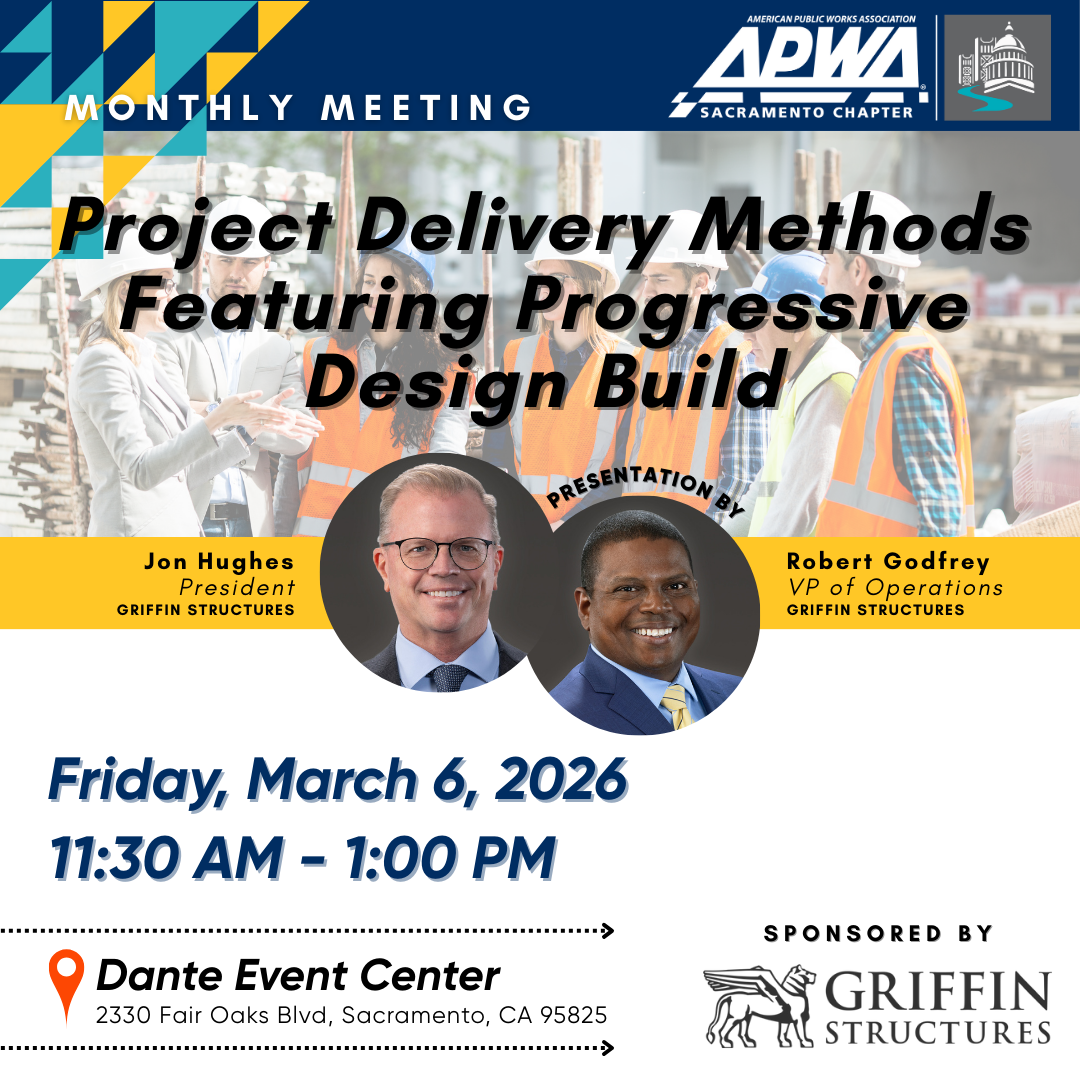 The American Public Works Association (APWA) Sacramento Chapter invites you to join its monthly meeting, featuring a presentation on Progressive Design Build Project Delivery.