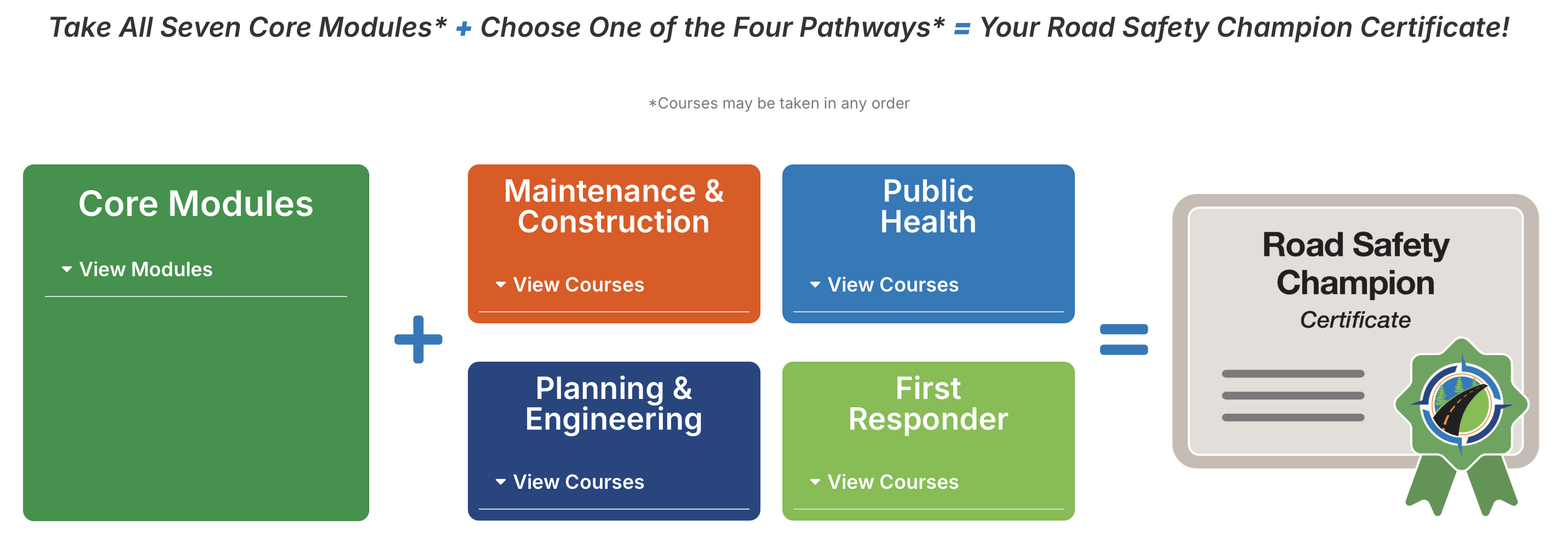 The RSCP includes seven core modules plus career-focused pathways. Once participants complete the seven core modules and one pathway, they are awarded a Road Safety Champion Program Certificate!