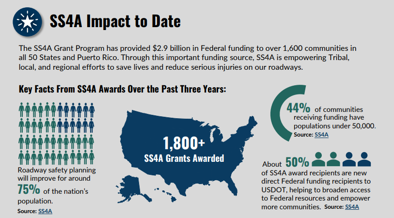 SS4A supports DOT's Roadway Safety Strategy and its goal of zero roadway deaths using a Safe System Approach.