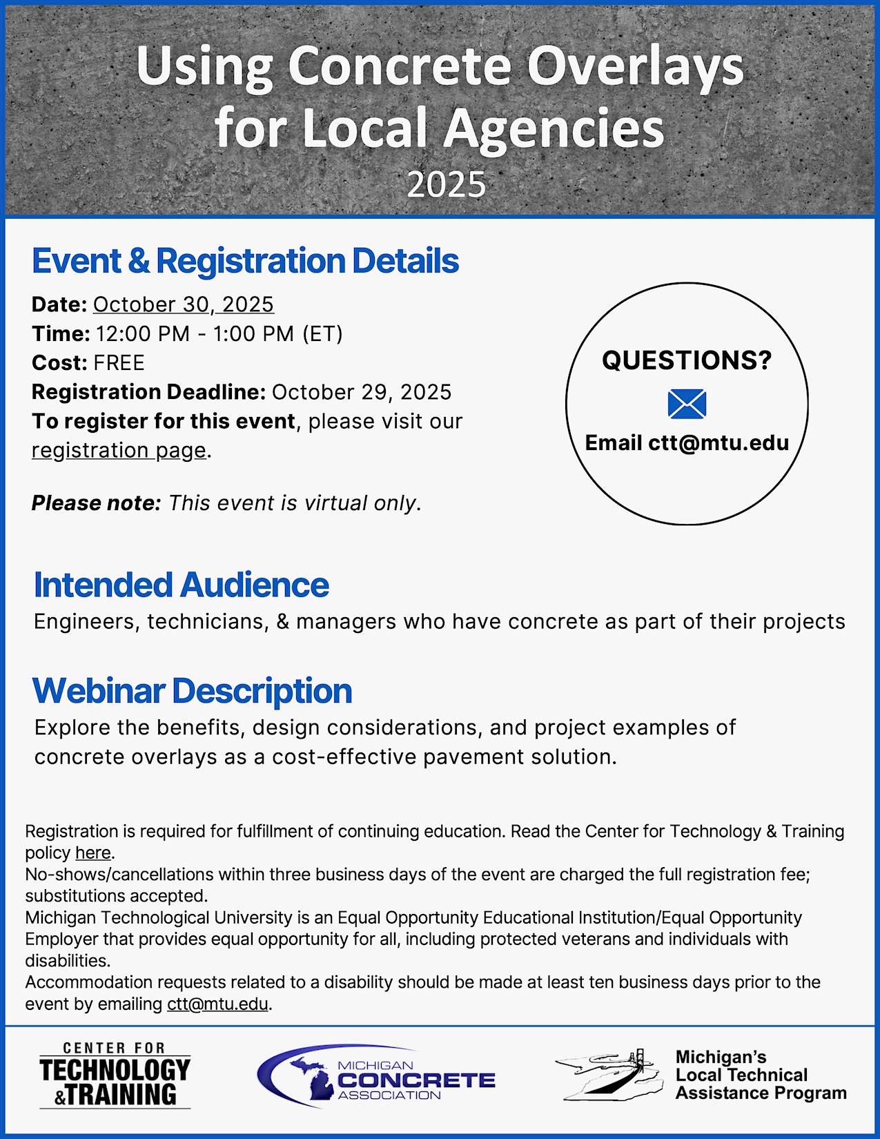Michigan Technological University's Center for Technology & Training (CTT) is hosting a free 1-hour webinar to explore the benefits, design considerations, and project examples of concrete overlays as a cost-effective pavement solution.