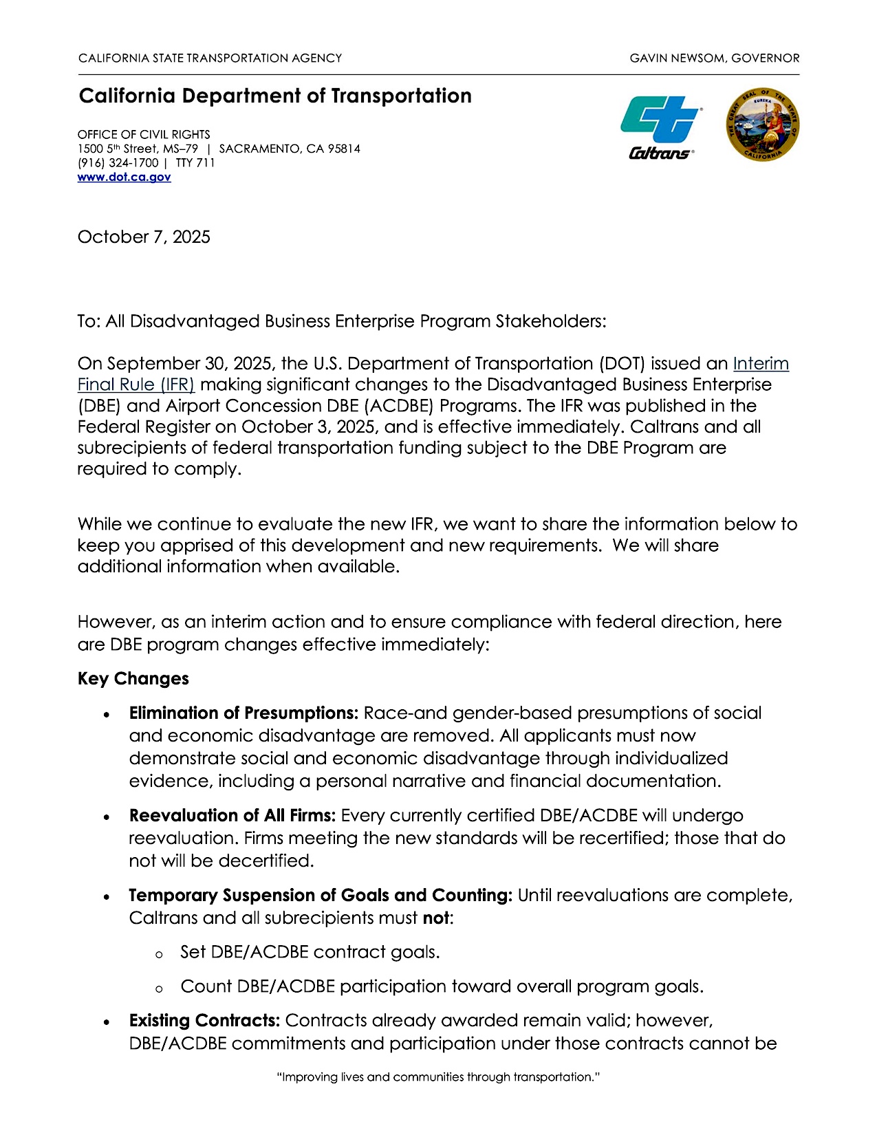 Below is the official advisory from the Caltrans Office of Civil Rights summarizing the key federal changes now in effect. This includes the suspension of DBE goal setting, reevaluation of certified firms, and new documentation requirements for certification.
