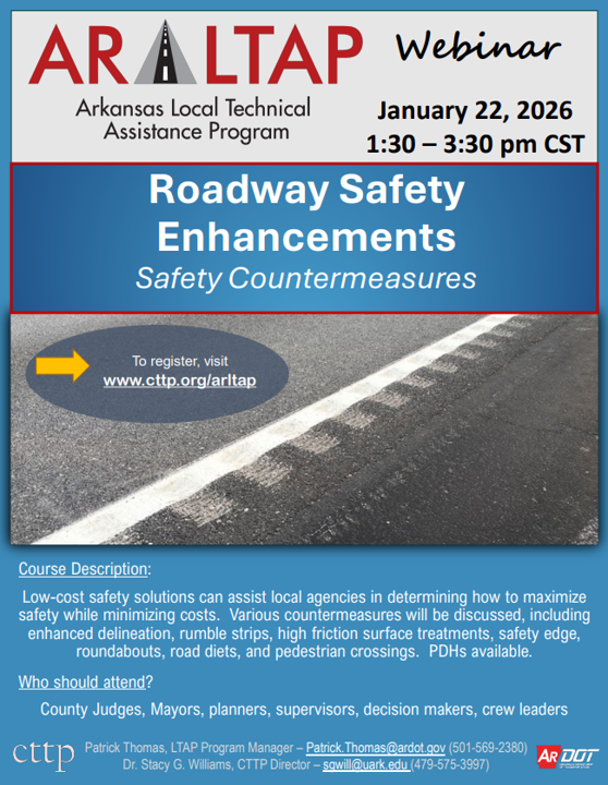 The Arkansas Local Technical Assistance Program (ARLTAP) is hosting the free webinar "Road Safety Enhancements: Safety Countermeasures".