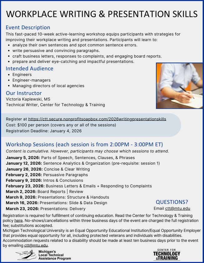 Michigan Technological University's Center for Technology & Training (CTT) is hosting a virtual workshop on Workplace Writing & Presentation Skills.