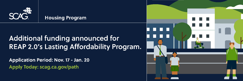 The Southern California Association of Governments (SCAG) is accepting applications for the second Notice of Funds Available under the Regional Early Action Planning (REAP) 2.0-funded Lasting Affordability Program. This competitive grant supports housing trust funds and catalyst funds working to create more housing supply and affordability across the region. Applications are due January 20, 2026.