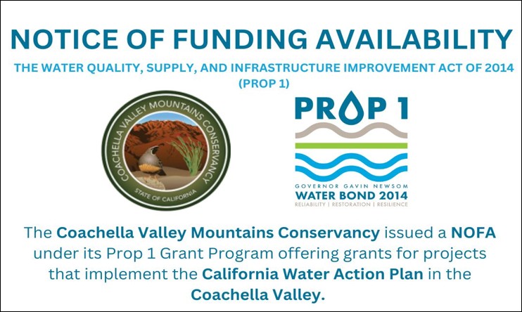 The Coachella Valley Mountains Conservancy (CVMC) has opened a new Notice of Funding Availability (NOFA) under the Proposition 1 Grant Program for projects that implement the California Water Action Plan (WAP) and address critical water management needs.