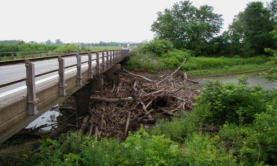 The lodging and buildup of streamflow drift against the bridge substructure interior supports and/or abutments is a frequent issue for stream-crossing bridges and can lead to structural damage, fire hazard, or other problems.