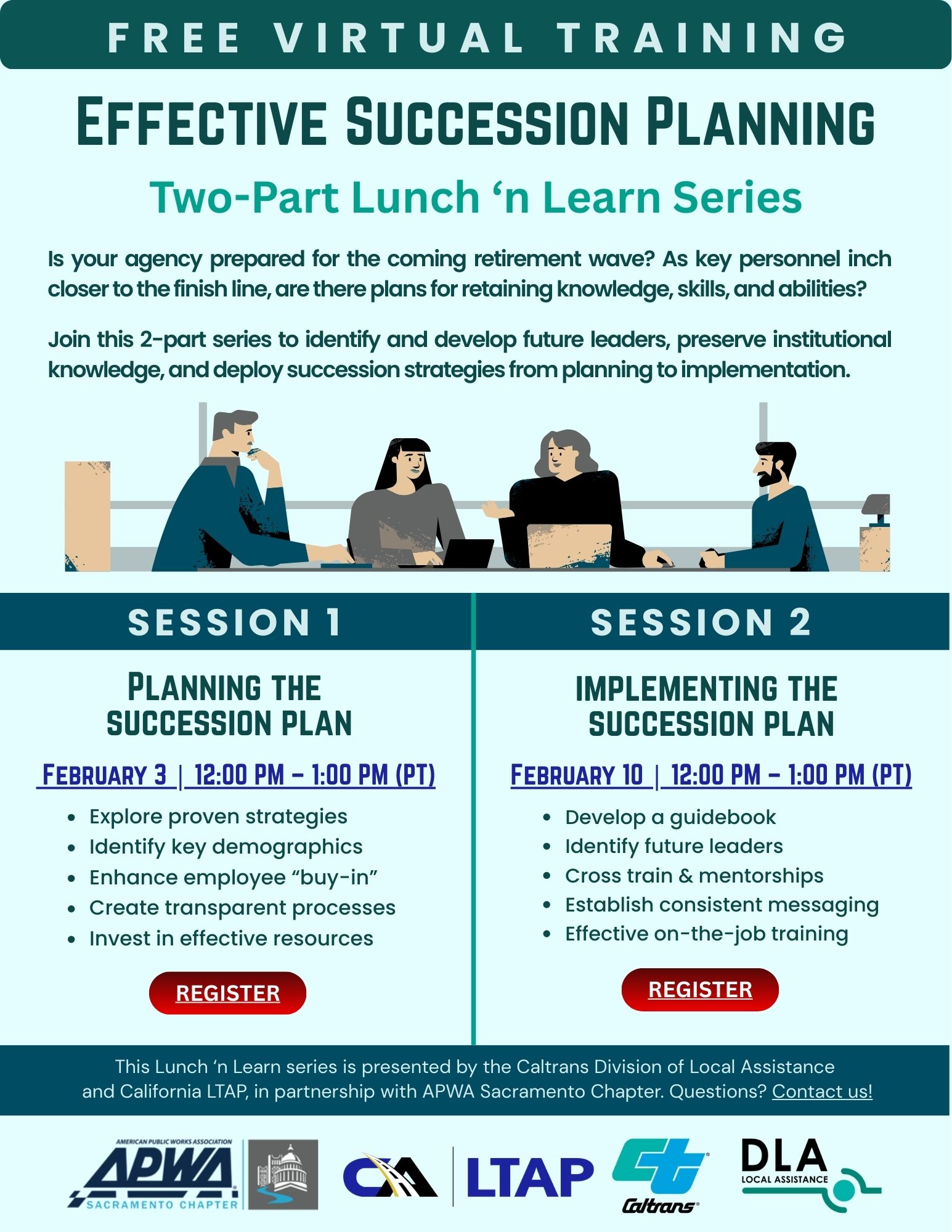 The California Local Technical Assistance Program (CALTAP) and the Caltrans Division of Local Assistance (DLA) are offering two free virtual Lunch 'n Learn sessions designed to help you build and implement effective succession planning strategies.
