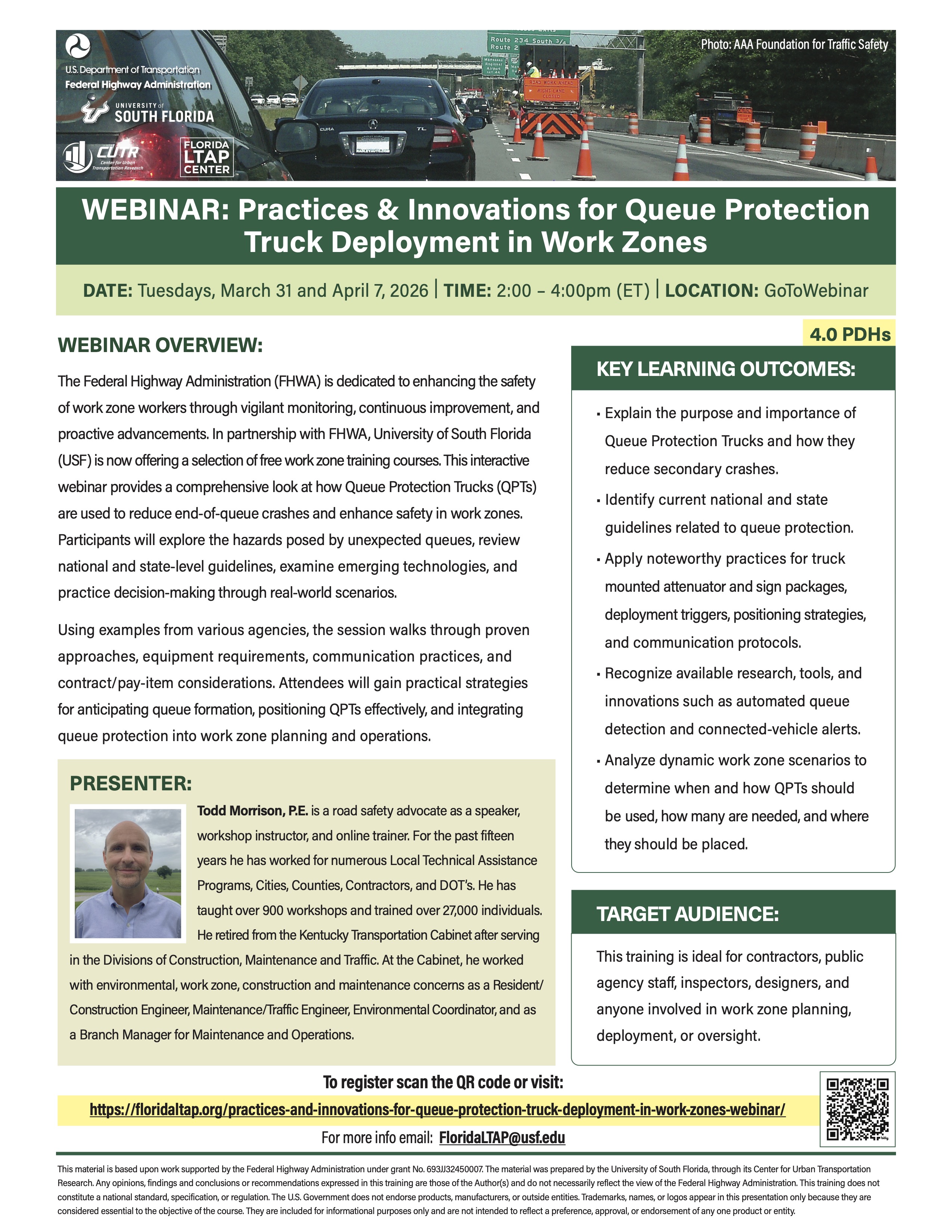 In partnership with FHWA, the Florida LTAP is offering a free 2-part webinar that provides a comprehensive look at how Queue Protection Trucks (QPTs) are used to reduce end-of-queue crashes and enhance safety in work zones. Participants will explore the hazards posed by unexpected queues, review national and state-level guidelines, examine emerging technologies, and practice decision-making through real-world scenarios.